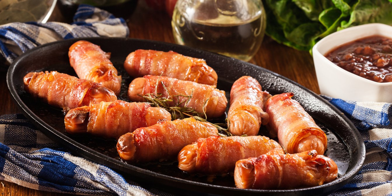 Британські «свинки в ковдрі». Всім сподобається назва цієї страви, і що може бути простішим за обгортання якісного бекону навколо смачної коктейльної ковбаски.