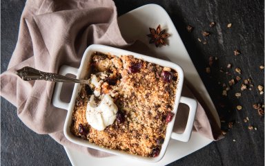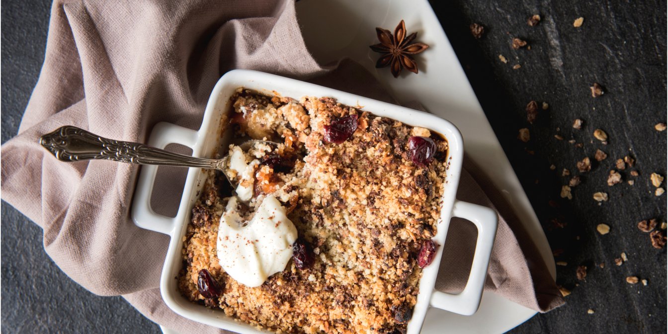 Форму застеліть пергаментом, змастіть маслом. Викладіть у форму половину крихти, на неї рівномірно розкладіть начинку і посипте рештою крихти.