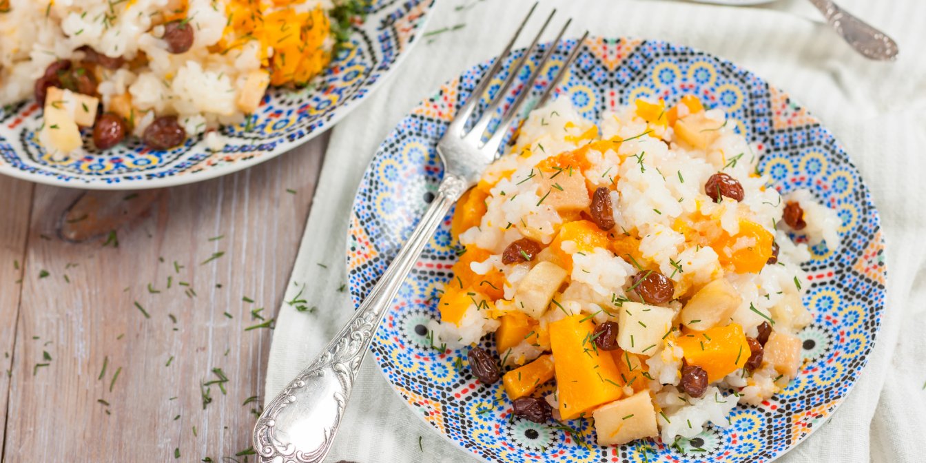 Запечені овочі і гарбуз наріжте кубиками. З’єднайте рис, родзинки, нарізані овочі і гарбуз. Посоліть, поперчіть, полийте олією і обережно перемішайте.