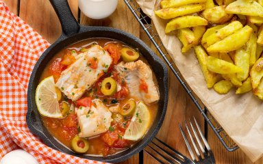 Тушкована тріска з оливками в томатному пюре — рибна страва, популярна в Італії, хоча у різних варіаціях її можна зустріти по всьому світу.
