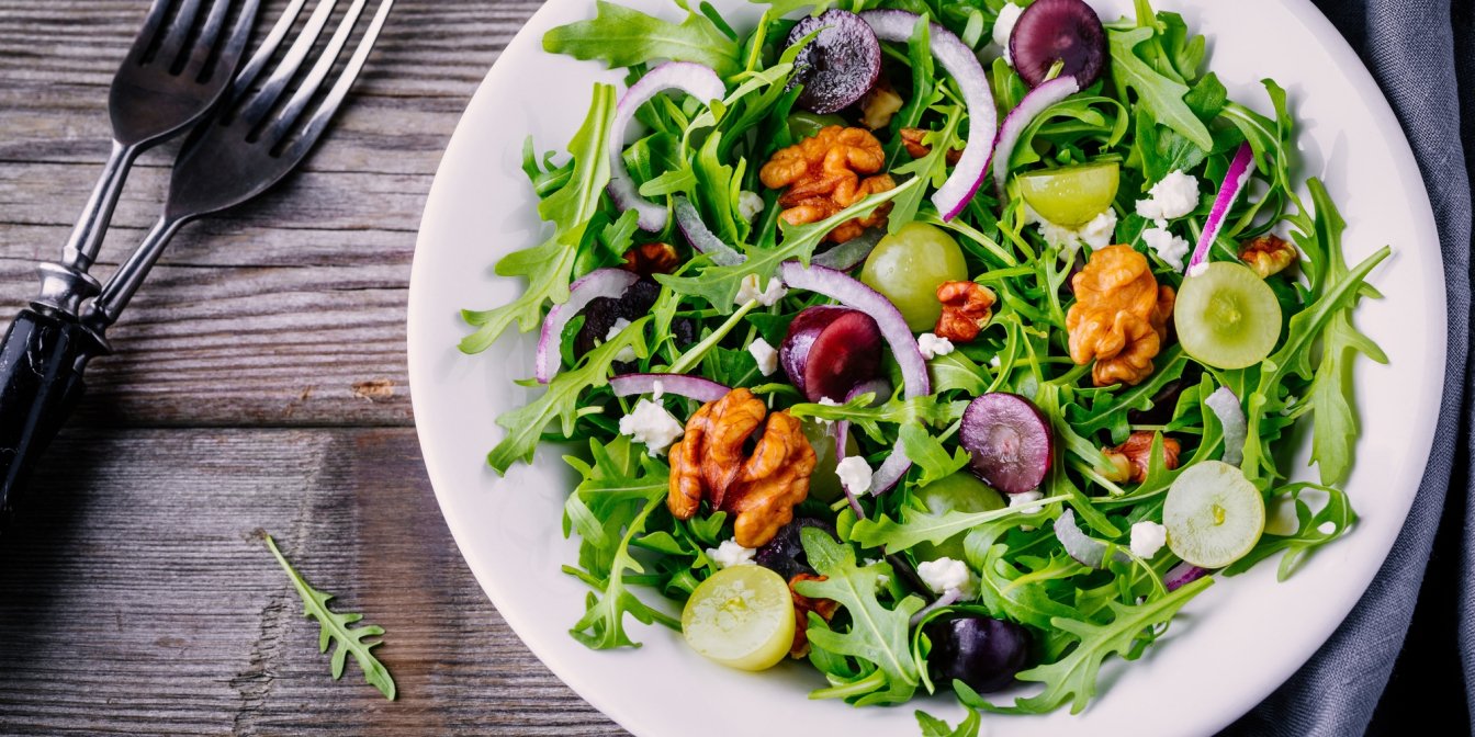 Легка гіркота руколи, солодкість винограду, хрусткість волоських горіхів і солоність фети створюють неймовірний симбіоз, який завершує пікантна заправка з оливкової олії, бальзамічного оцту і лимонного соку.