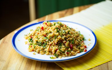 Ця страва може нагадати вам близькосхідний салат табуле, адже він так само містить булгур і зелень. Проте родзинкою цього салату є рубіново-червоні зерна граната, які додають тарілці соковитості і яскравості, а також вітамінів.