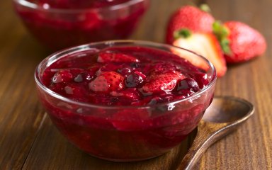 Покладіть полуницю й вишню в банку першими. Посипте рекомендованою кількістю цукру (з розрахунку 230 г цукру на кожні 450 г фруктів) і дайте настоятися щонайменше 1 годину.