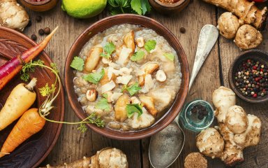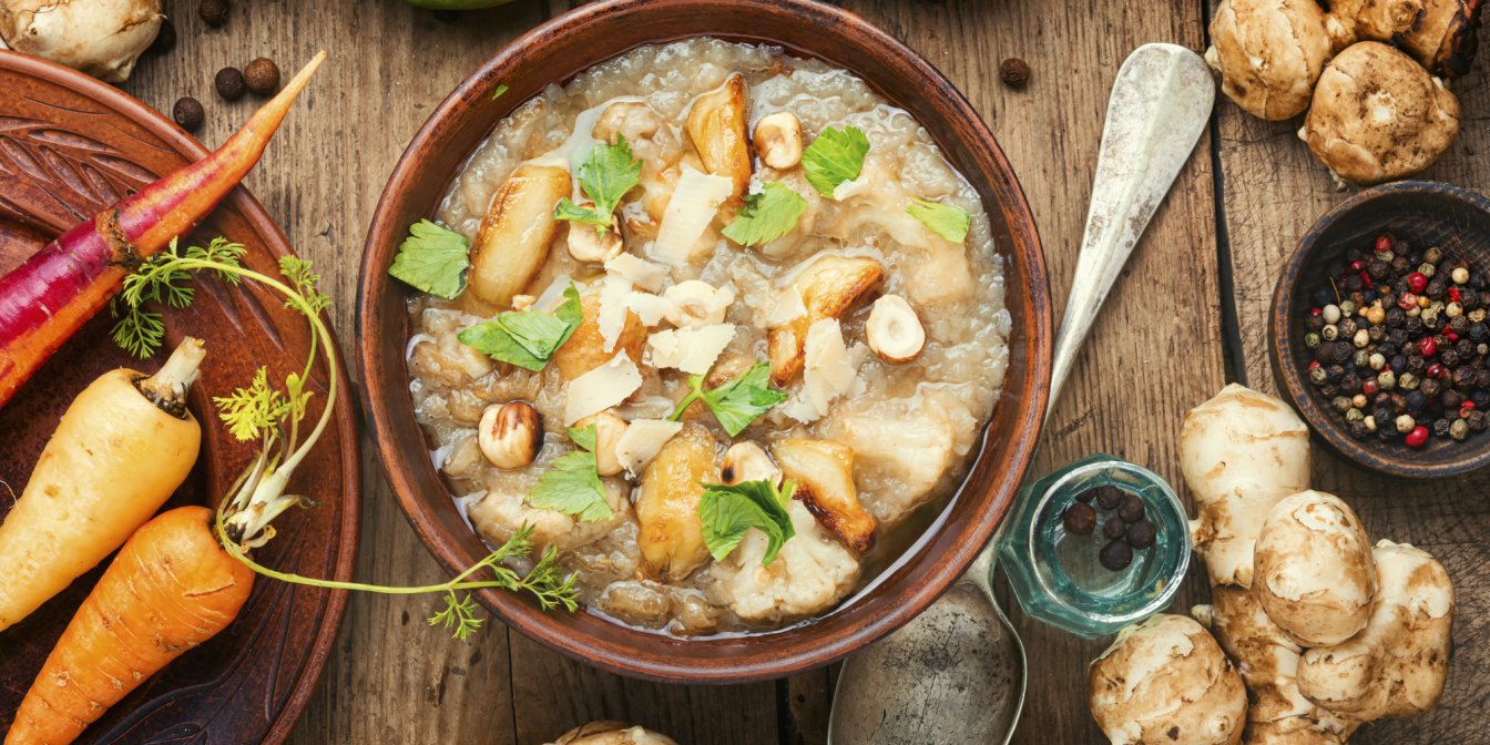 У цьому наваристому супі поєднуються білі гриби, морква, селера та топінамбур. Продукти різні, з різними смаками та ароматами, але легко комбінуються в одній простій страві. Подавайте такий суп з хрумким хлібом, скориставшись нашою добіркою рецептів.