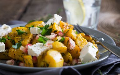 Салат із солодкою картоплею, фетою та зернятками граната під неймовірно смачною гранатовою заправкою — це панацея від стресу, адже батат із гранатом в парі — це джерело вітамінів групи В, яких зараз, як ніколи, потребує наша нервова система.