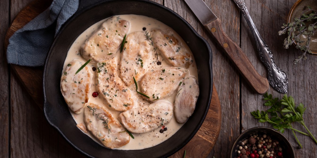 Розігрійте духовку до 200 градусів. Курку покладіть у форму (ідеально, якщо це буде глиняна форма) та залийте соусом. Запікайте у духовці протягом 15 хвилин. Подавайте до столу цю неймовірно ніжну вершкову курку з лавашем та овочами.