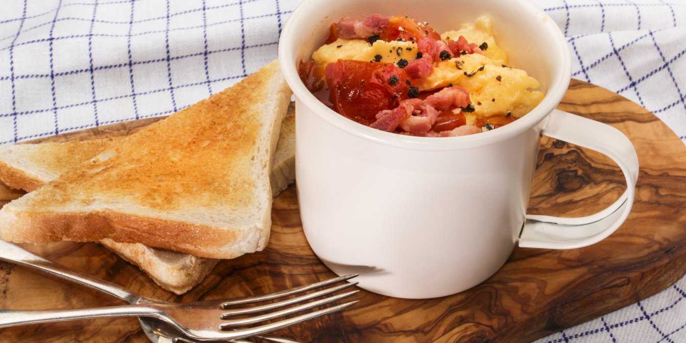 Якщо потрібен швидкий і поживний сніданок, то це може бути яєчня або різні омлети. Омлет у чашці за 5 хвилин отримаємо за допомогою мікрохвильової печі. Для краси та додаткової користі додамо помідори й зелень.