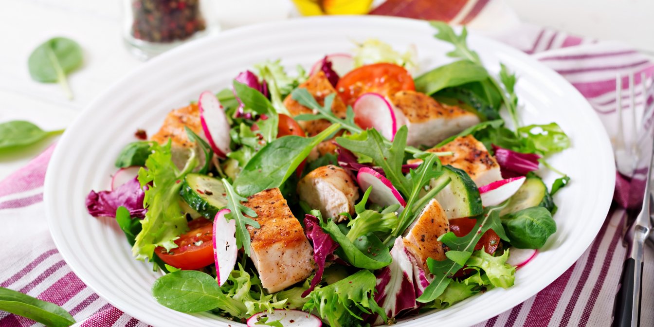 На дно салатника викладіть салатні листки, потім — овочі, часточки мандаринів і заправте песто. Зверху покладіть мариновані шматочки курки і посипте зеленою цибулею.