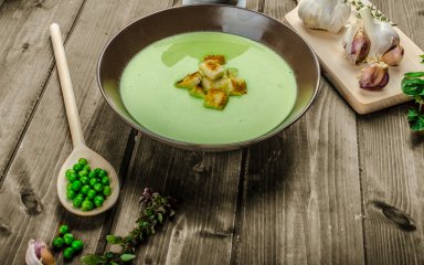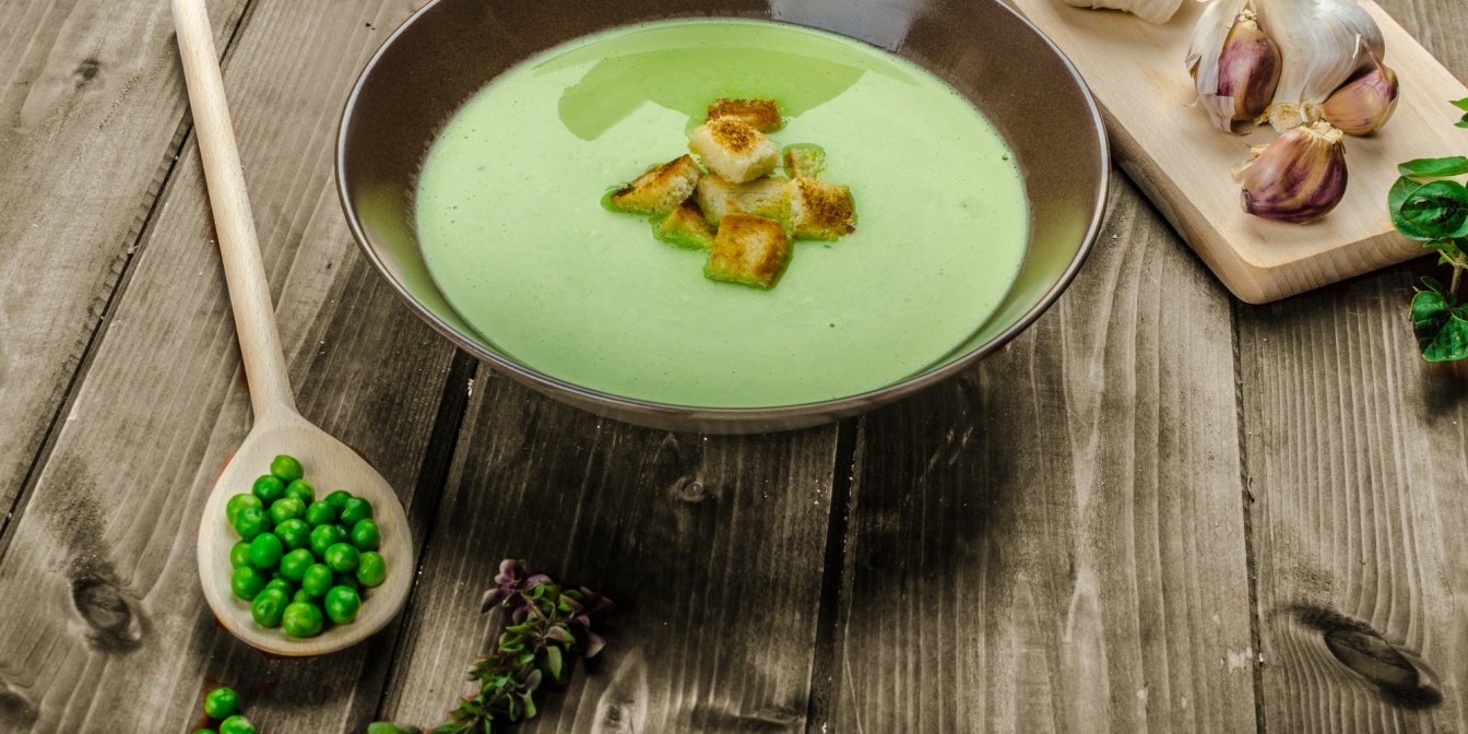 Щоб зварити вітамінний суп з пореєм, вам знадобиться зелений заморожений горошок, часник і шпинат. Суп готується на м’ясному або овочевому бульйоні й прикрашається при подаванні насінням гарбуза або мигдалевими пластівцями.