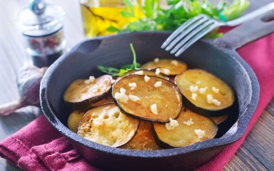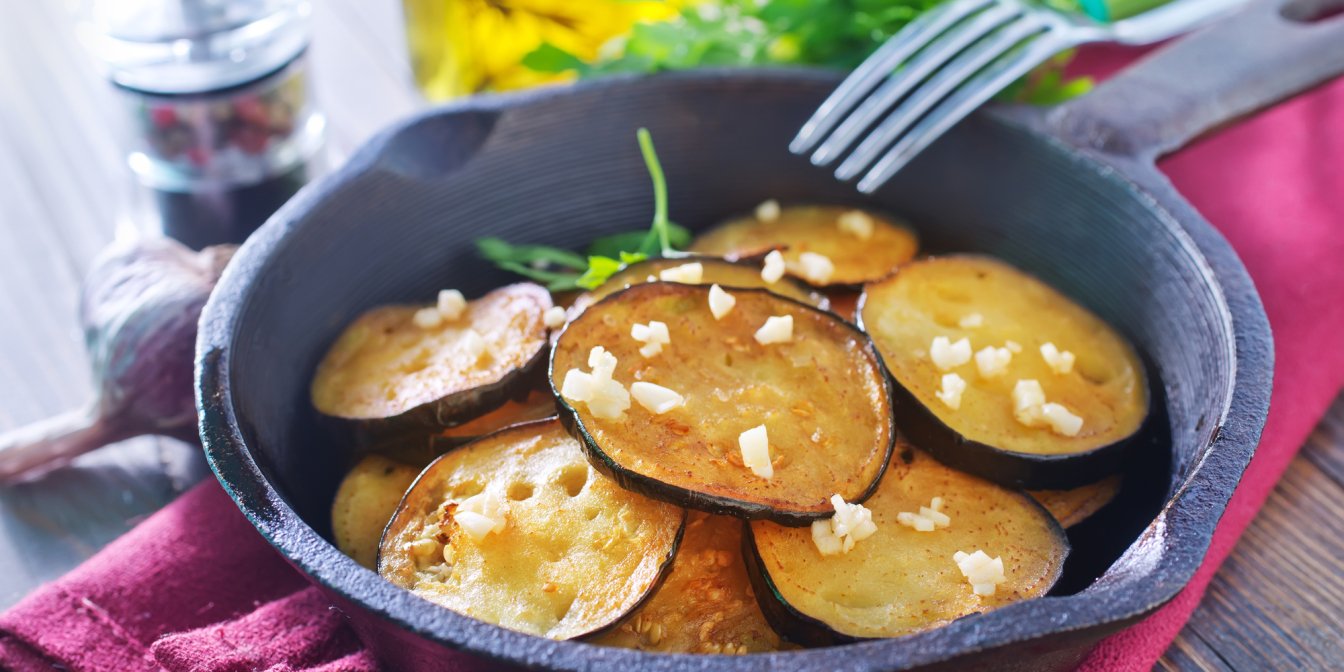На сковороді з антипригарним покриттям розігрійте олію, додайте баклажани і обсмажте по дві-три хвилини з кожного боку або до золотистого кольору. Викладіть на паперові рушники.