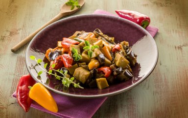 Очистіть перець і разом з баклажаном наріжте кубиками. Змішайте їх з іншими овочами в каструлі. Готуйте протягом 10 хвилин.