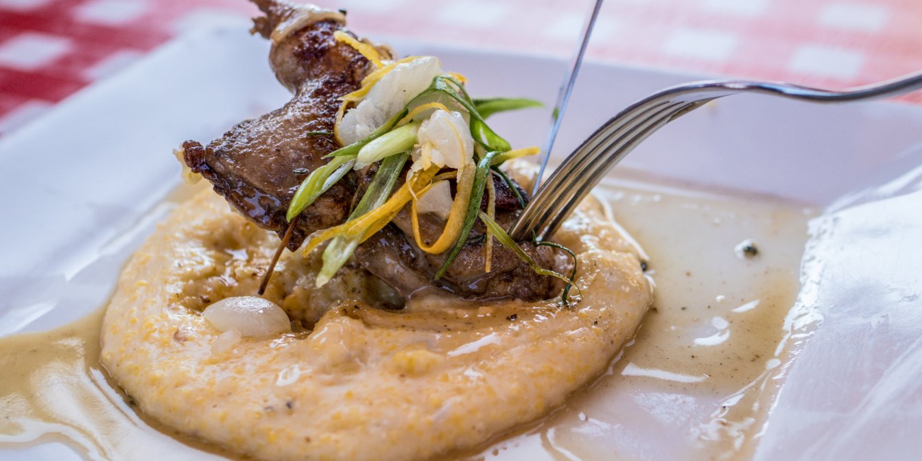 Подавайте кролика з соусом, овочами і полентою.