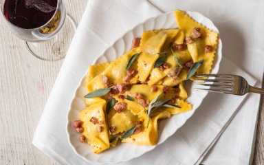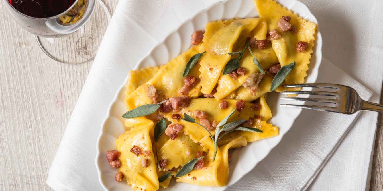Ми пропонуємо вам casoncelli alla bergamasca: пасту з начинкою з м’ясного фаршу, печива амаретті, пармезану, родзинок і спецій. Вироби мають форму півмісяця і покриваються соусом на основі вершкового масла, пармезану й бекону.