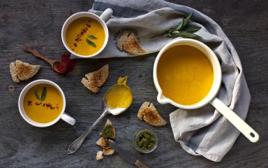 З гарбуза можна приготувати безліч страв: від гарбузових оладок на сніданок до солодких ролів з гарбузом і яблуками на десерт. Є в нас і пропозиція на обід — гарбузовий крем-суп, приправлений песто. Соус дає контраст солодкості гарбуза, не перекриваючи його смаку.