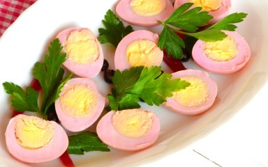 Зварені круто яйця очистіть і покладіть у банку. Влийте у неї бурякову рідину разом зі шматочками буряка, закрийте банку і залиште остигати на 3 години. Після закінчення необхідного часу розріжте яйця навпіл, посипте сіллю, перцем і петрушкою. Смачного!