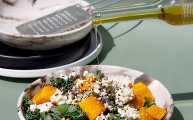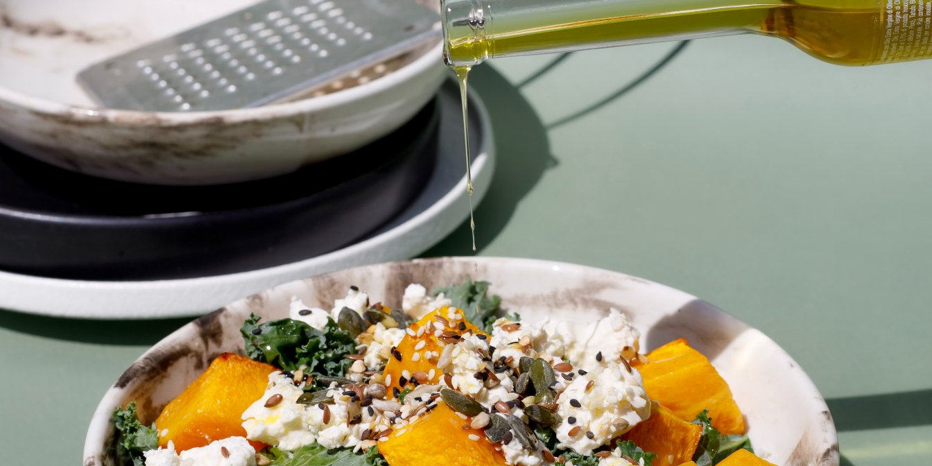 Для цього теплого салату потрібна запечена морква в солодкому маринаді, гарбузове насіння, мікс салатів, сир, кінза та коріандр. Саме останній надасть правильного пряного присмаку, козячий сир огорне маслянистим вершковим смаком, а морква з медом розкриє всю суть салату.