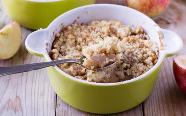 Із часом крамбл набув популярності у світі, з'явилися різноманітні його варіації. Пропонуємо дуже смачний варіант десерту з яблуками, вівсяними пластівцями й кисломолочним сиром на сніданок.