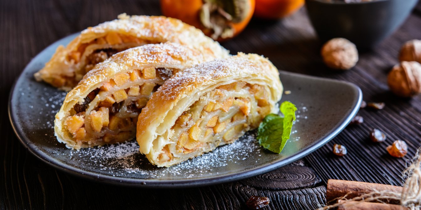 Штрудель з хурмою — ідеальний десерт для холодних днів. Листкового тіста, хурми, яблук, родзинок і волоських горіхів вистачить, щоб створити щось дивовижне.