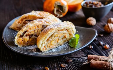 Якщо ви любите штрудель, то скоріше за все вам сподобається і ця його варіація з хурмою. Завдяки природній солодкості фрукта, на додачу до класичних інгредієнтів — яблук, волоських горіхів, родзинок і кориці, десерт стає ще кращим.