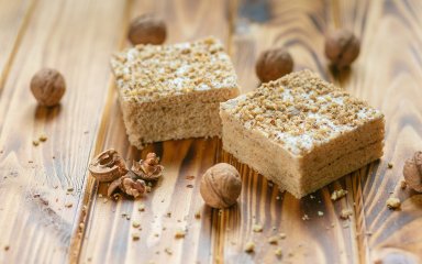 Готовий корж змастіть заварним кремом і наріжте квадратиками.