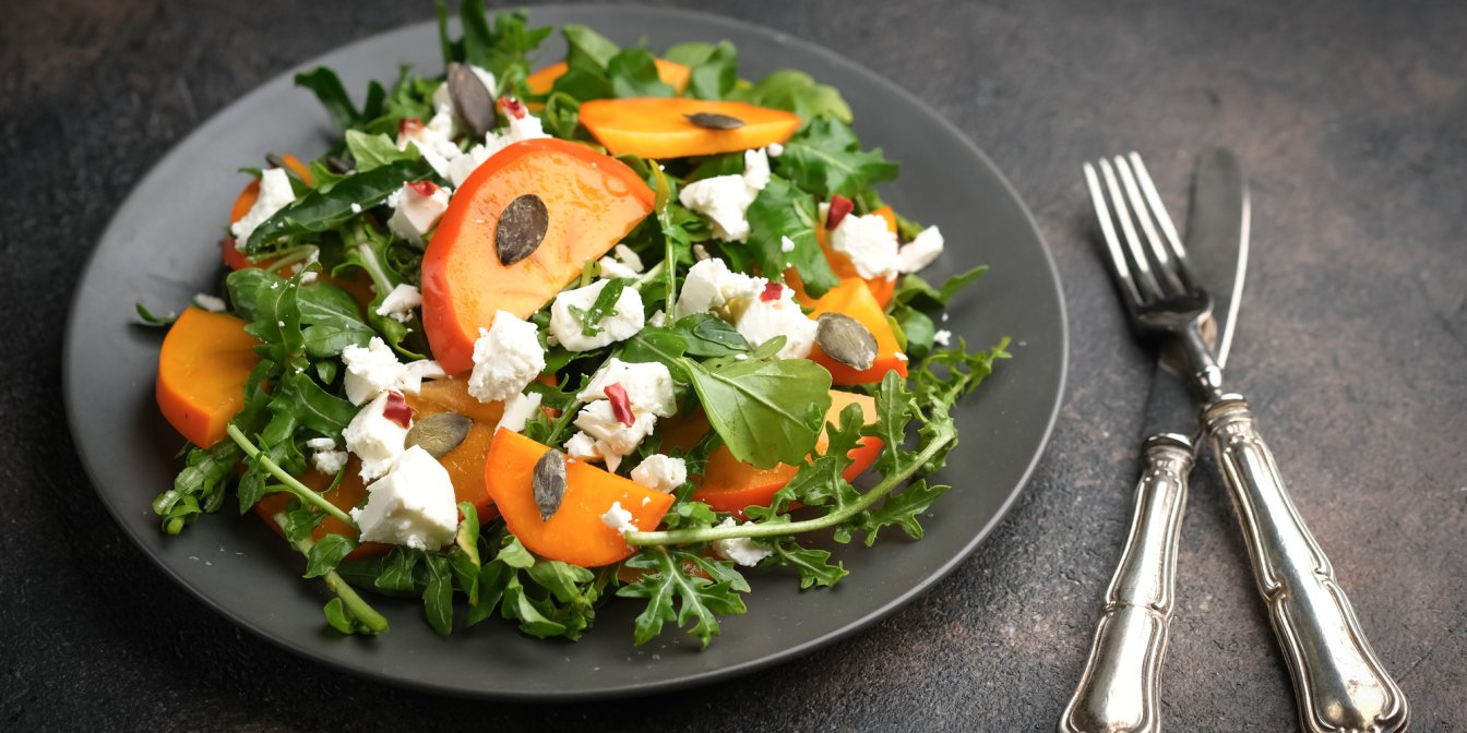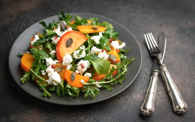 Салат з хурмою, руколою і фетою — це смачна й повноцінна вегетаріанська страва, яку можна подавати як ситний гарнір або легку основну страву.