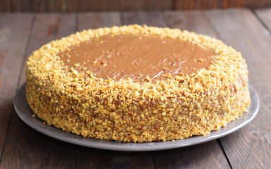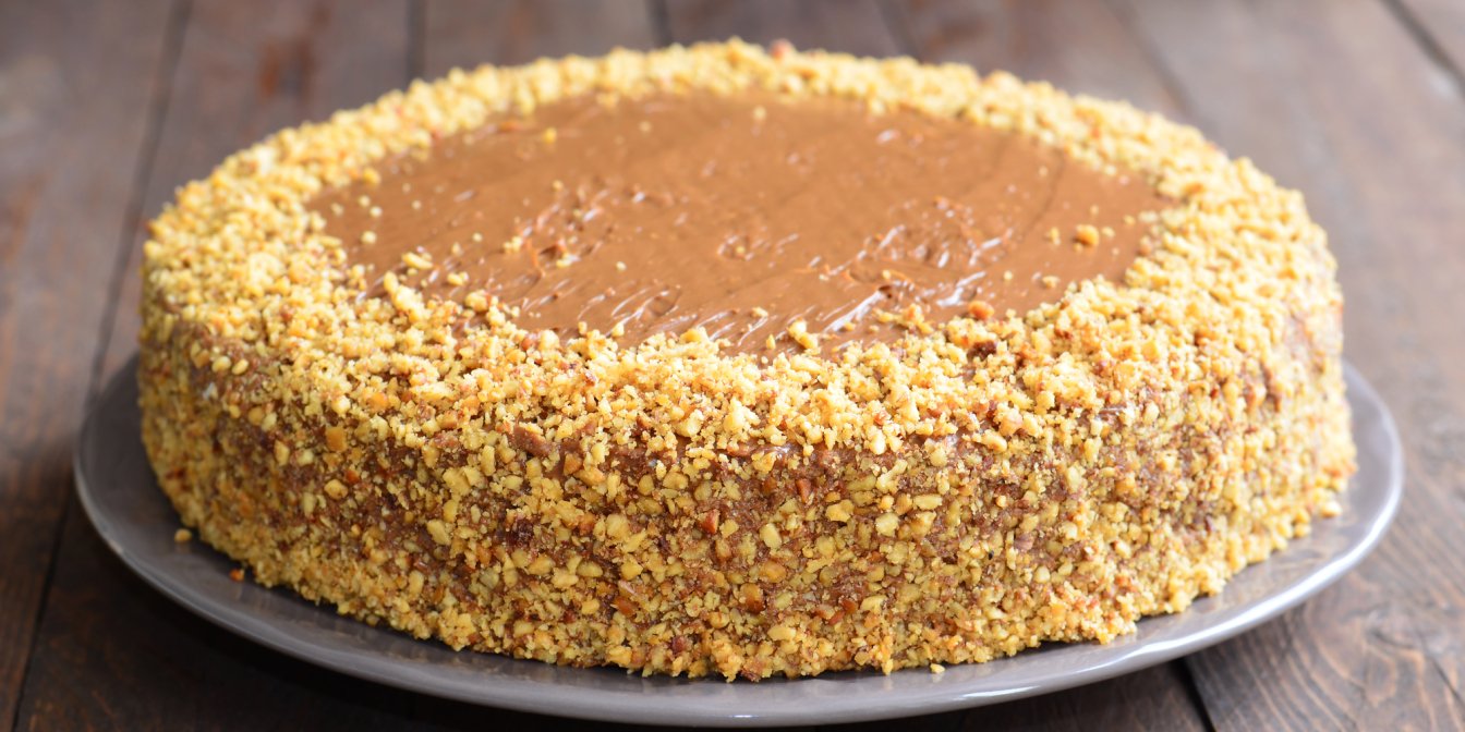 Обмажте кремом повністю всю поверхню торта, прикрасьте горіхами та сховайте в холодильник на 2-3 години.
