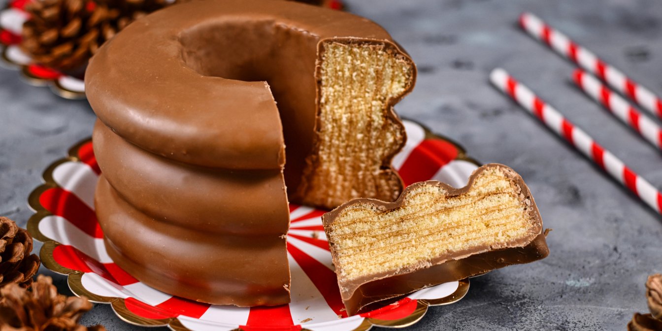Баумкухен — ідеальний десерт для особливих випадків, здатний підкорити навіть найвибагливіших гурманів. Його готують з кількох м’яких коржів, промащених абрикосовим джемом, і зверху покривають чарівною глазур’ю з чорного шоколаду. Щоб торт за формою нагадував стовбур дерева, вам знадобиться конусоподібна форма для випічки або, як у нашому випадку, звичайна качалка.