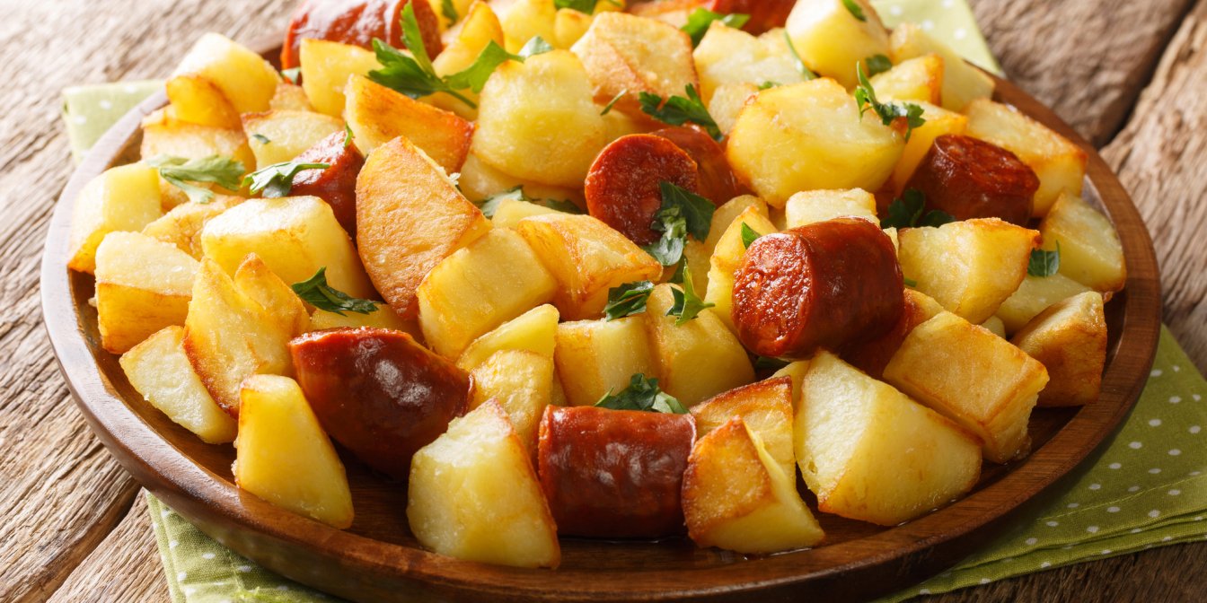 Запечена з часником і розмарином картопля може супроводити м’ясну тарілку або будь-яку м’ясну чи рибну страву. Найсмачнішим вибором може стати лосось, приготований з ковбасками чорізо. Обидві страви готуються легко і не вимагають багато інгредієнтів.