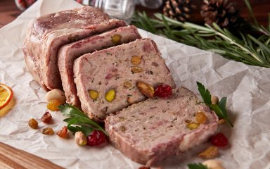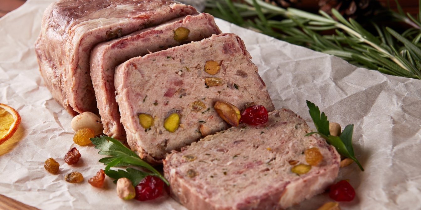 Терин зі свинини з фісташками — смачний і особливий рецепт, який підходить для свят. І приготувати його досить легко! Спочатку вам треба зробити м’ясний фарш, збагатити його фісташками і сформувати рулет у формі, вистелений беконом. Останній крок — випікання в духовці.