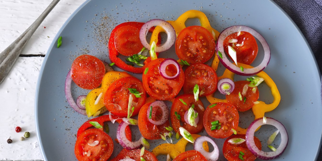 Овочі помийте і обсушіть. Помідори наріжте скибочками. Перець очистіть від серцевини і наріжте соломкою. Цибулю очистіть і нашинкуйте тонкими півкільцями. З гранату дістаньте зернята. М’яту помийте, обсушіть і подрібніть.