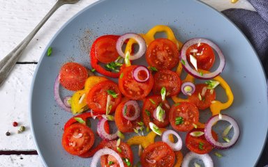 Ця страва втілює дух літнього салату в зимовому варіанті. Помідори, солодкий перець і цибуля, приправлені зернами і соком гранату разом з оливковою олією, часником і спеціями, виходять легкими, освіжаючими, ароматними і з приємним хрускотом.