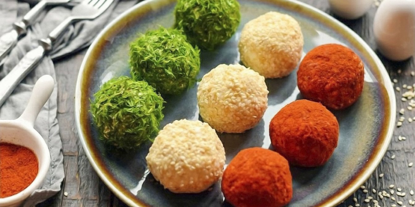 Приступайте до декору: обваляйте першу порцію сирних кульок у кропі, другу — в насінні кунжуту, а третю — в паприці. Солоні трюфелі готові! Розкладіть їх по паперових вкладках і відразу ж подавайте до столу або зберігайте в холодильнику, доки не прийде час дегустації.