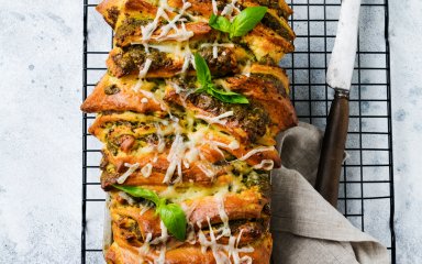 У рецепті тісто для піци з насінням кунжуту намазується спеціальним соусом та покривається гострим сиром чедер. Потім додають пікантний яловичий фарш, приправлений так само, як і соковиті бургери, а також солоні огірки, скибочки свіжих помідорів і ще більше сиру.