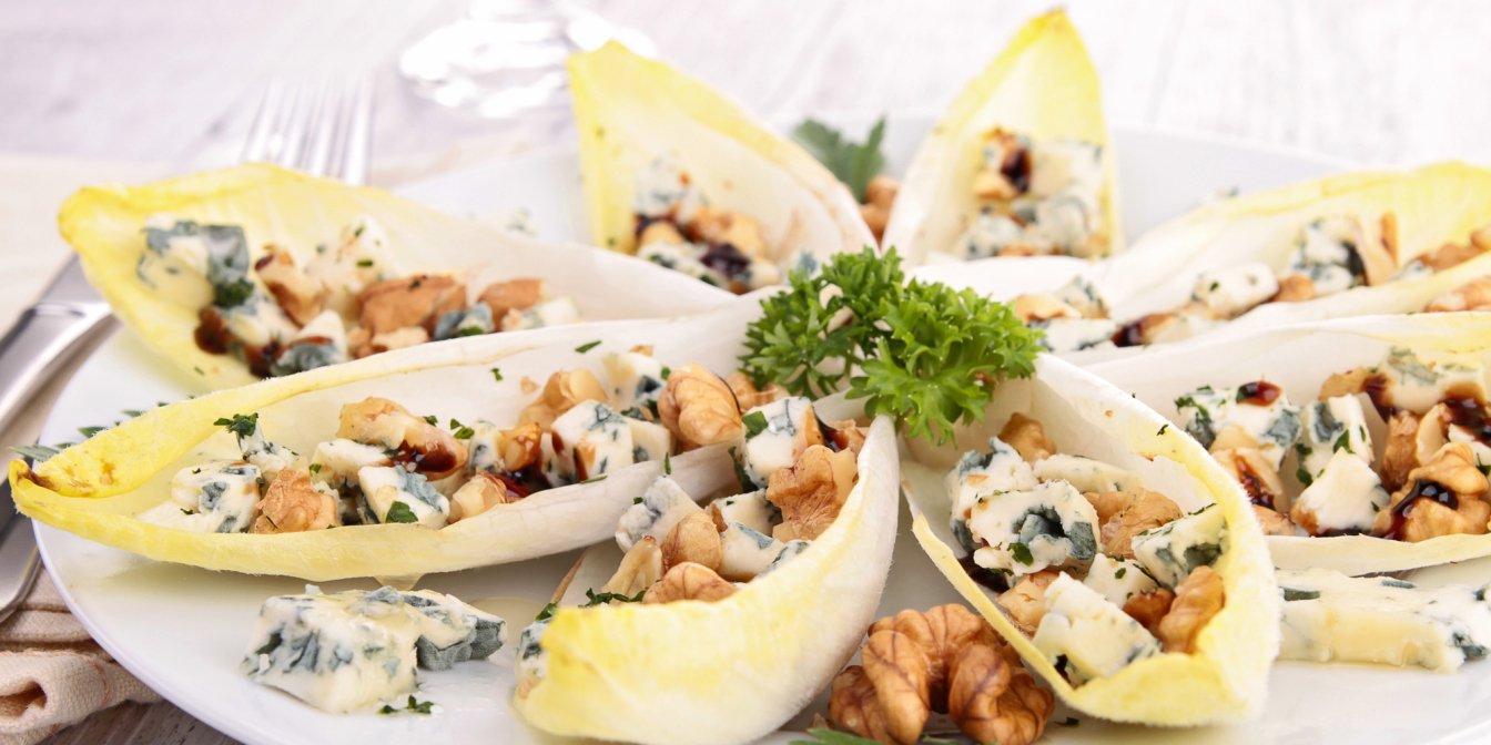 Можна подати суміш яблук, горіхів й сиру під заправкою, у човниках зроблених з листя цикорія.