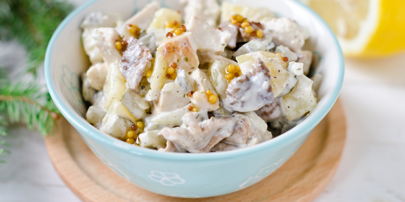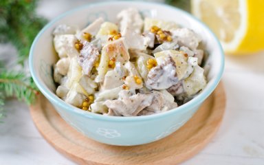 Цей салат з куркою, маринованими грибами і огірками цілком може стати частиною новорічного меню.