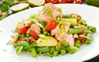 Відварена картопля й обсмажена сьомга поєднуються з чері, консервованим горошком і спаржевою квасолею в одній смачній і поживній страві.