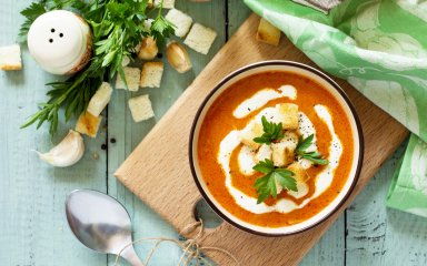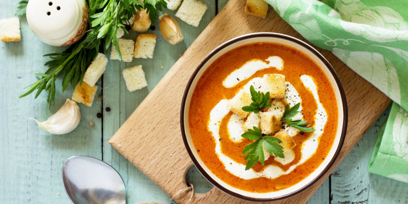 Подавайте суп-пюре з картоплі і помідорів з крутонами, які нададуть йому приємної хрусткої нотки.