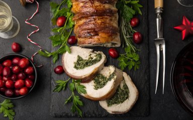Простий у приготуванні, цей рулет з індички має особливу начинку. Вона складається з ароматних спецій: прованських трав, карі, куркуми, хмелі-сунелі й імбиру.