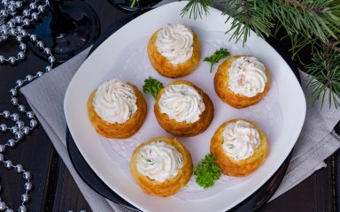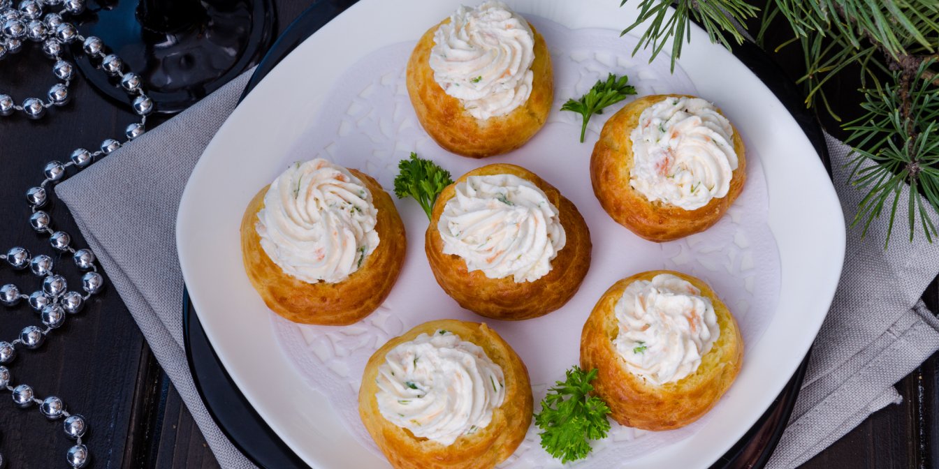 Профітролі з лососем — ідеальна закуска для новорічного меню або особливої події. Вона чудово поєднується із шампанським і сухим білим вином.
