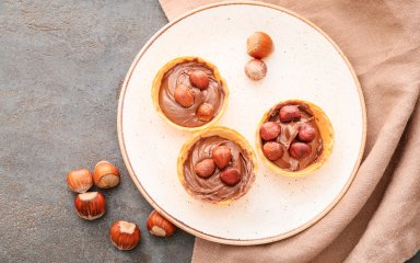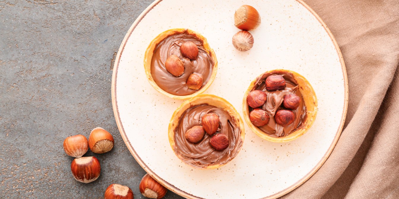 Коли йогуртові тарталетки будуть готові, наповніть їх горіховою пастою і прикрасьте фундуком перед подачею.