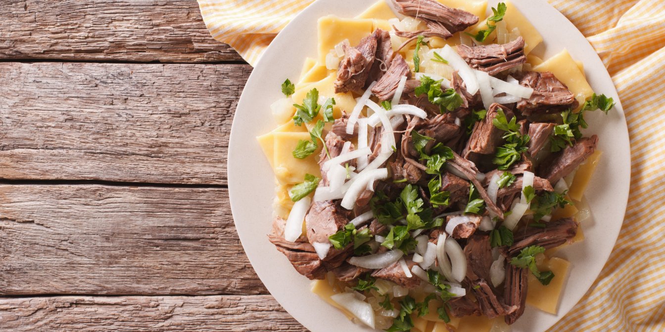 Що таке бешбармак? Це відварене м’ясо (традиційно баранина, але можна використовувати курянину, яловичину, індичку) у поєднанні з цибулевим соусом та домашнею товстою лапшою. Усі ці інгредієнти укладаються шарами на великий таріль і подаються на середину святкового столу. Приготуйте лаваш і подавайте також до цієї страви, а окремо — бульйон з бешбармака.