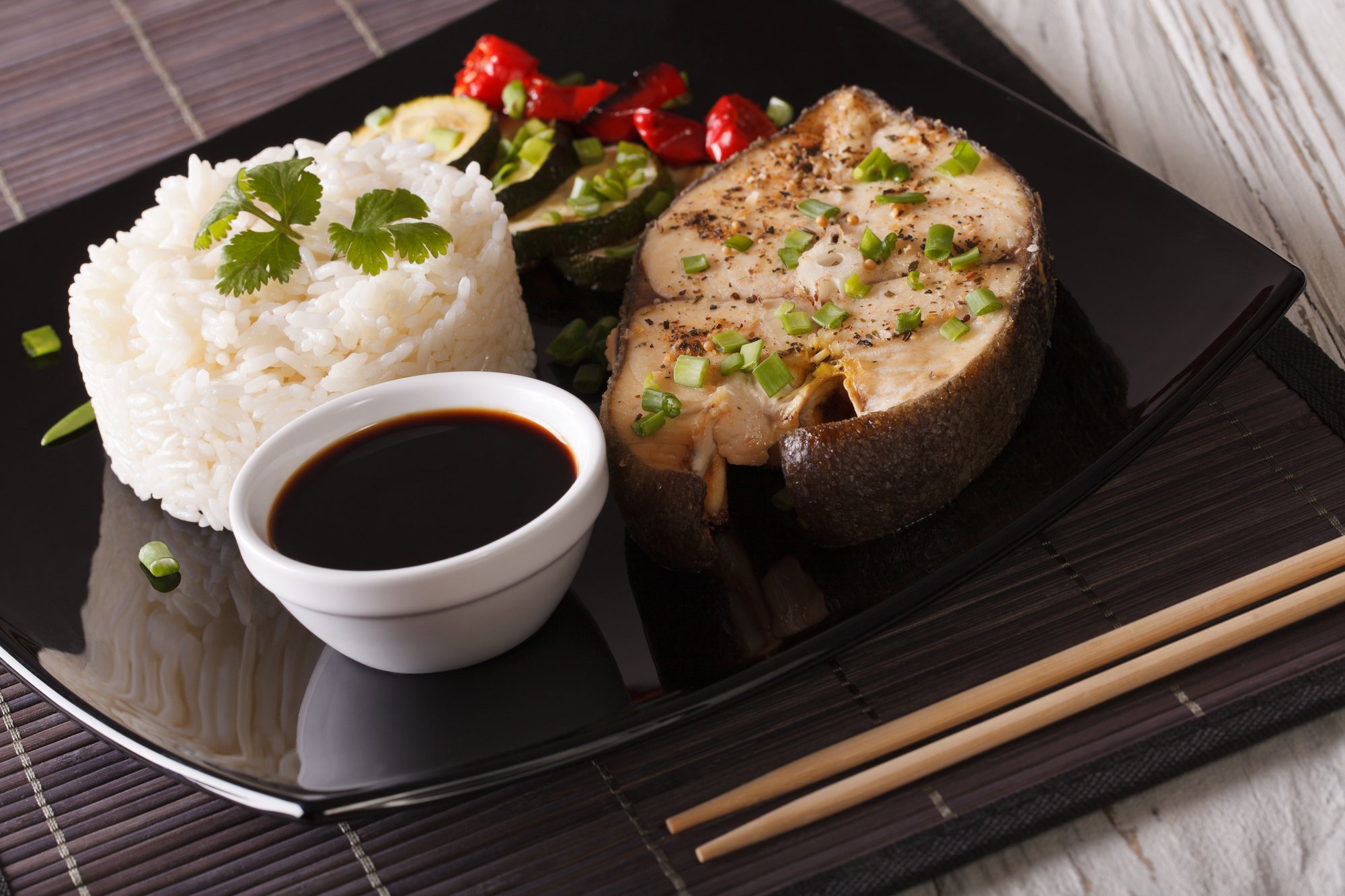 Рис, рибний стейк, соєвий соус Фото: Depositphotos