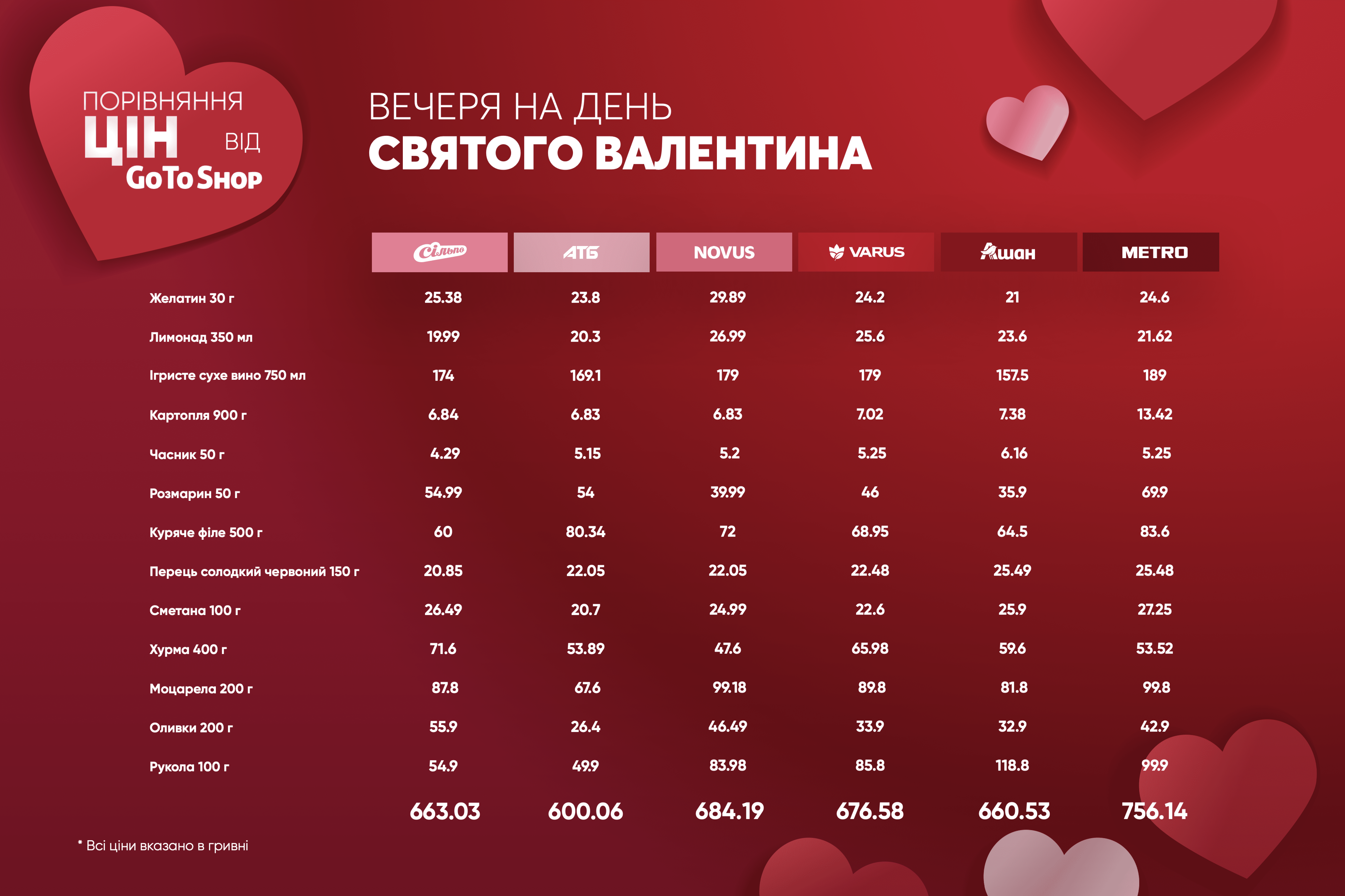 Гастрожурналістка, головна редакторка гастрономічного порталу SHUBA Маша Сердюк на честь 14 лютого склала повноцінне меню на двох, а також порівняла, скільки коштуватимуть продукти для цих страв, якщо купити їх у різних супермаркетах.