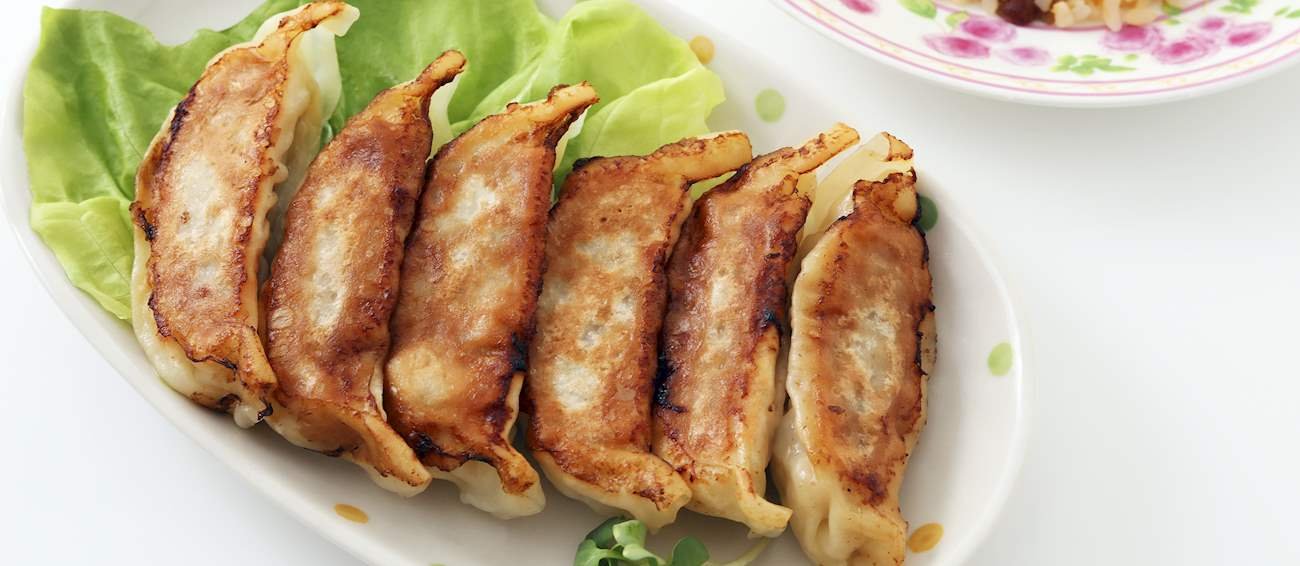 Смажені на сковороді пельмені зі свининою, капустою, зеленою цибулею, імбиром, рисовим вином та кунжутною олією.