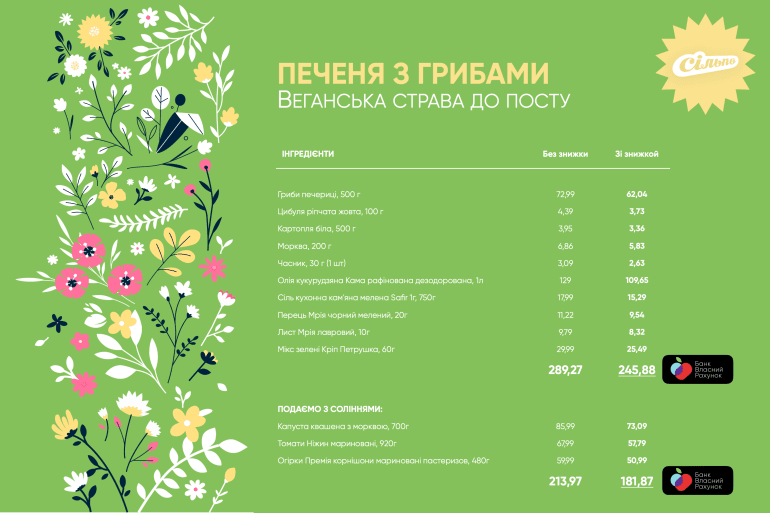 Розповідаємо, що саме ми приготували із продуктів, які ми купили за допомогою Банку Власний Рахунок, і ділимося повноцінним меню для вечері на чотирьох осіб. Оскільки на дворі піст, то й рецепт ми також пропонуємо пісний, тобто веганський — печеню з грибами.