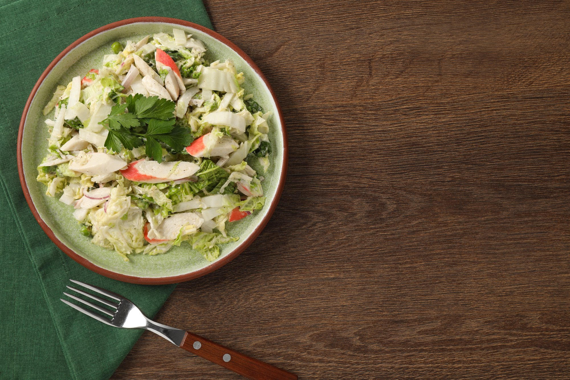 Цей салатик для обіду або вечері цікаво відтінить основну страву й стане ідеальним партнером ніжному картопляному пюре. Вам знадобиться пучок весняної черемші, пекінська капуста, свіжий огірок і трохи крабових паличок. Стильно й смачно!