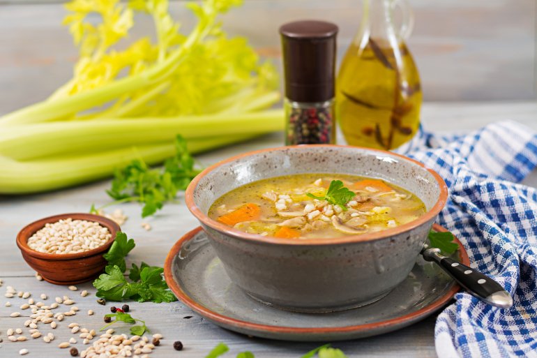 Ця перша страва з індичкою наситить вас на довгий час. Знадобиться година на приготування, проте воно точно того варте. До речі, для прискорення процесу ви можете попередньо залити крупу теплою водою на декілька годин — перловка набухне і звариться швидше.
