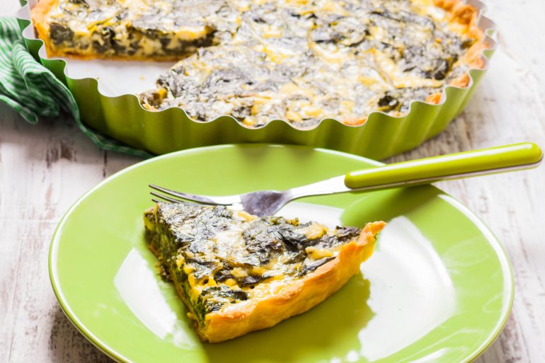 Для крему (заливки) візьміть 125 мл молока, 175 мл жирних вершків, 2 середні яйця, 1 ст. л. свіжого естрагону, 100 г тертого сиру чедер, 180 вареного нарізаного шпинату, 60 г вареної або консервованої квасолі, сіль та перець — на смак.