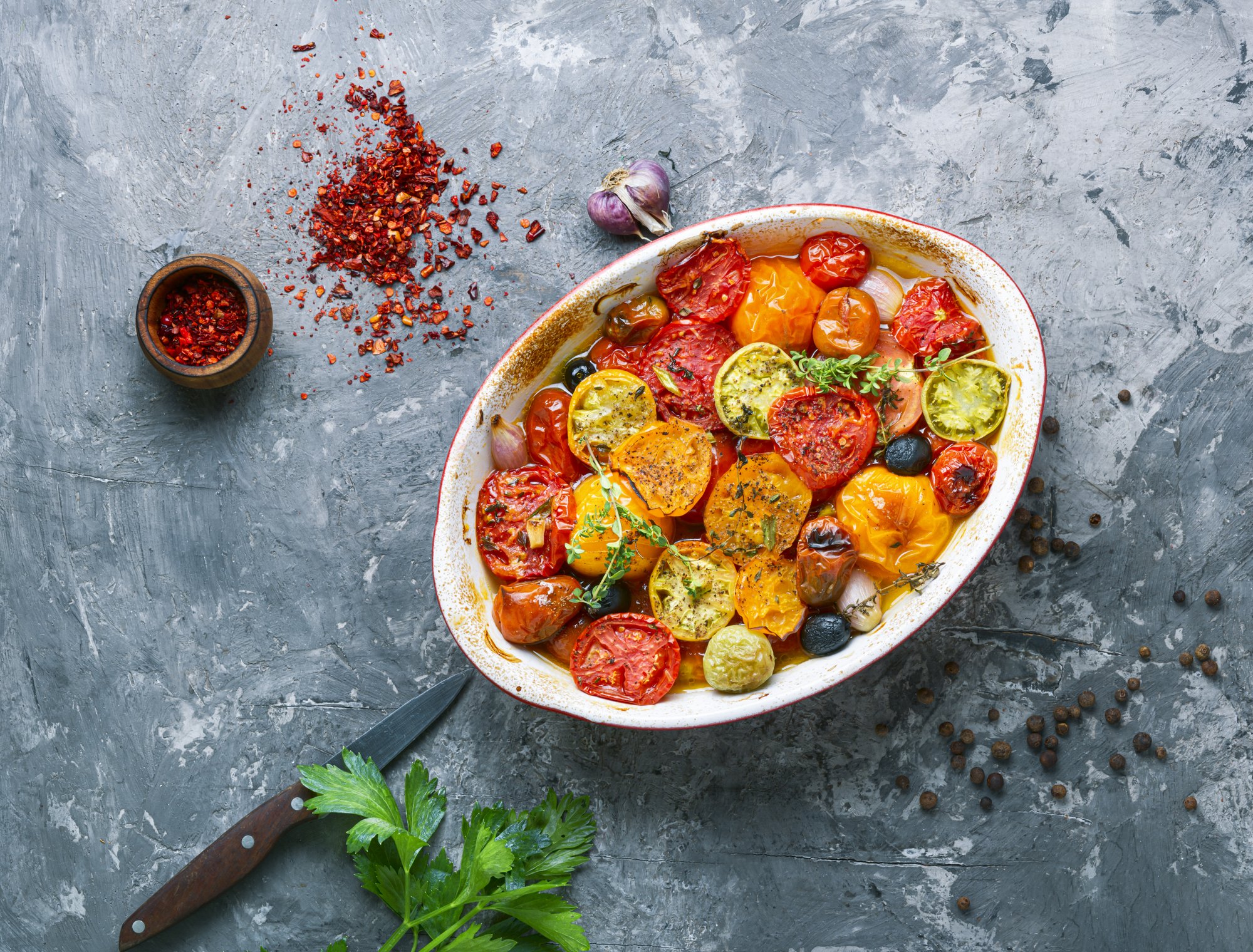 Якщо ви бажаєте відсвяткувати День святого Валентина вегетаріанською вечерею або, на ваш погляд, м’ясна страва буде неповною без овочевого гарніру — приготуйте соковитий і духмяний салат із запечених овочів. Для цього вам знадобляться томати, солодкий перець та ще кілька простих інгредієнтів.
