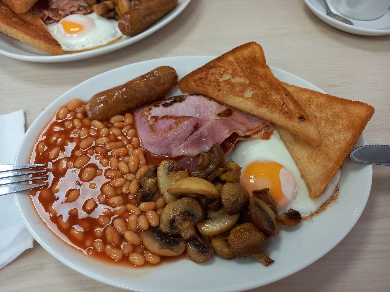 Справжній англійський сніданок, який ви можете отримати до 11 ранку у більшості кафе Сполученого Королівства, буде складатися з ковбасок, яєшні, консервованої квасолі, печериць, підсмажених на грилі помідорів й підсмаженого бекону.
